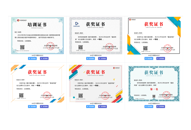 系统内置海量精美证书模板库,涵盖荣誉证书、培训证书、获奖证书等多种类型,设计专业大气,风格多样任您选择。支持一键导入模板,快速生成专业、优雅的电子证书;同时提供灵活的自定义编辑功能,可自由调整文字、排版、印章、背景等元素,满足活动颁奖、教育培训、认证等各类场景需求,助您轻松打造高品质、个性化的电子证书!